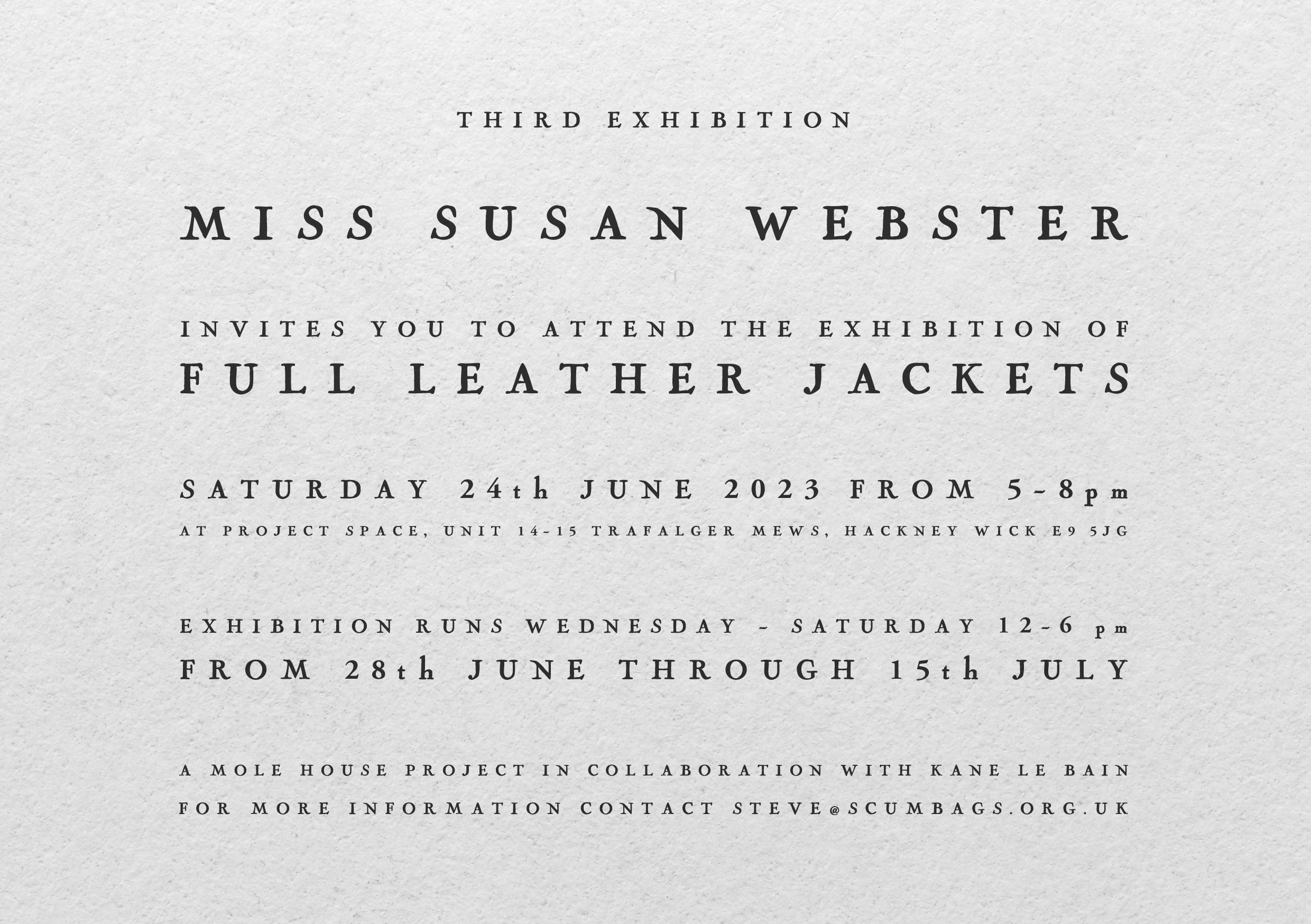 |  | 2023 |   | Full Leather Jackets The Exhibition Project Space, London 28th June - 15th July 2023 |  | |||||||||||||