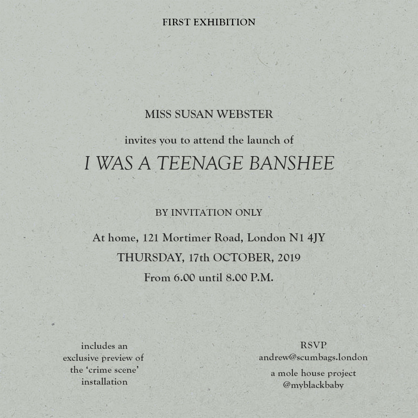 |  | 2019 |   | I Was A Teenage Banshee Book Launch and exclusive preview of the 'crime scene installation' Mole House Projects, London 2019. |  | |||||||||||||