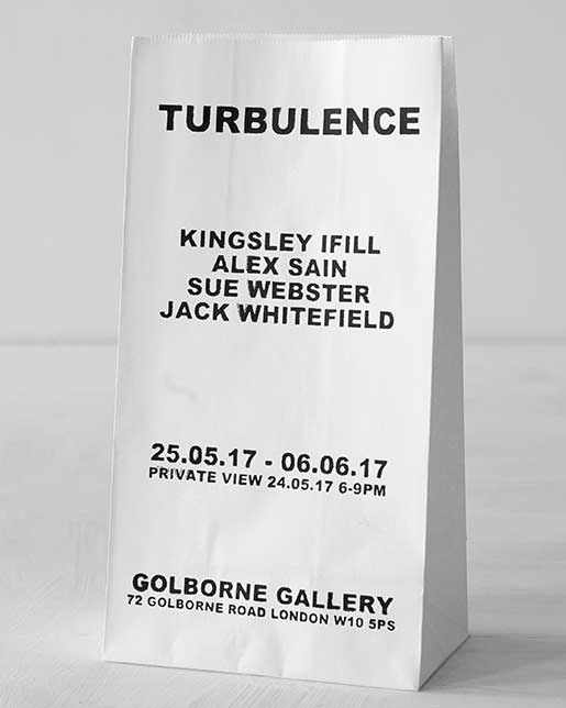 |  | 2017 |   | Turbulence Golborne Gallery, 72 Golborne Road, London, W10 5PS 25th May - 6th June 2017 Private View: 24th May 6-9pm Curated by Alex Sain As yet another general election approaches, Turbulence brings together the work of British artists Kingsley Ifill, Alex Sain, Sue Webster and Jack Whitefield, aiming to illustrate the uncertainty of the times in which we are currently living. Where do we go from here? Can art, through self-expression, make any positive contribution or are we merely adding fuel to the fire? |  | |||||||||||||